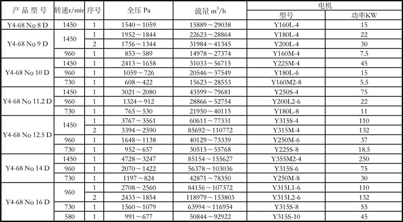 G4-68、Y4-68型離心通、引風(fēng)機(jī)適用于火力發(fā)電廠中230t/h以下蒸汽鍋爐的通、引風(fēng)配套。在無(wú)其他特殊要求時(shí),G4-68型亦可用于礦井通風(fēng)及一般通風(fēng)。