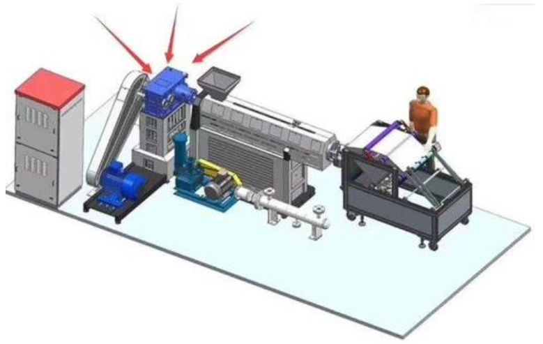 自動上料機自動吸入拉絲級聚丙稀送至擠出機,擠出機加熱熔化PP顆粒至液態(tài)。羅茨鼓風機或空壓機和儲氣罐壓縮空氣送至烘箱加熱,熱空氣通過壓力使熔化成液態(tài)的聚丙烯材料從噴頭噴射而出形成絲狀物(噴頭內(nèi)含數(shù)以百計的小孔)后,噴出的絲狀物水平到達接收設(shè)備,然后用滾壓機軋制無紡布。