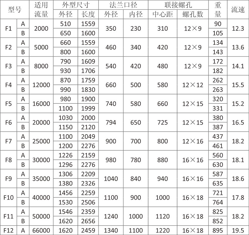 F型消聲器使用風(fēng)量2000-66000m3/h,使用溫度為150℃以下,消聲器可達20-25dB(A),阻力損失小于300mmH2O(294pa)。